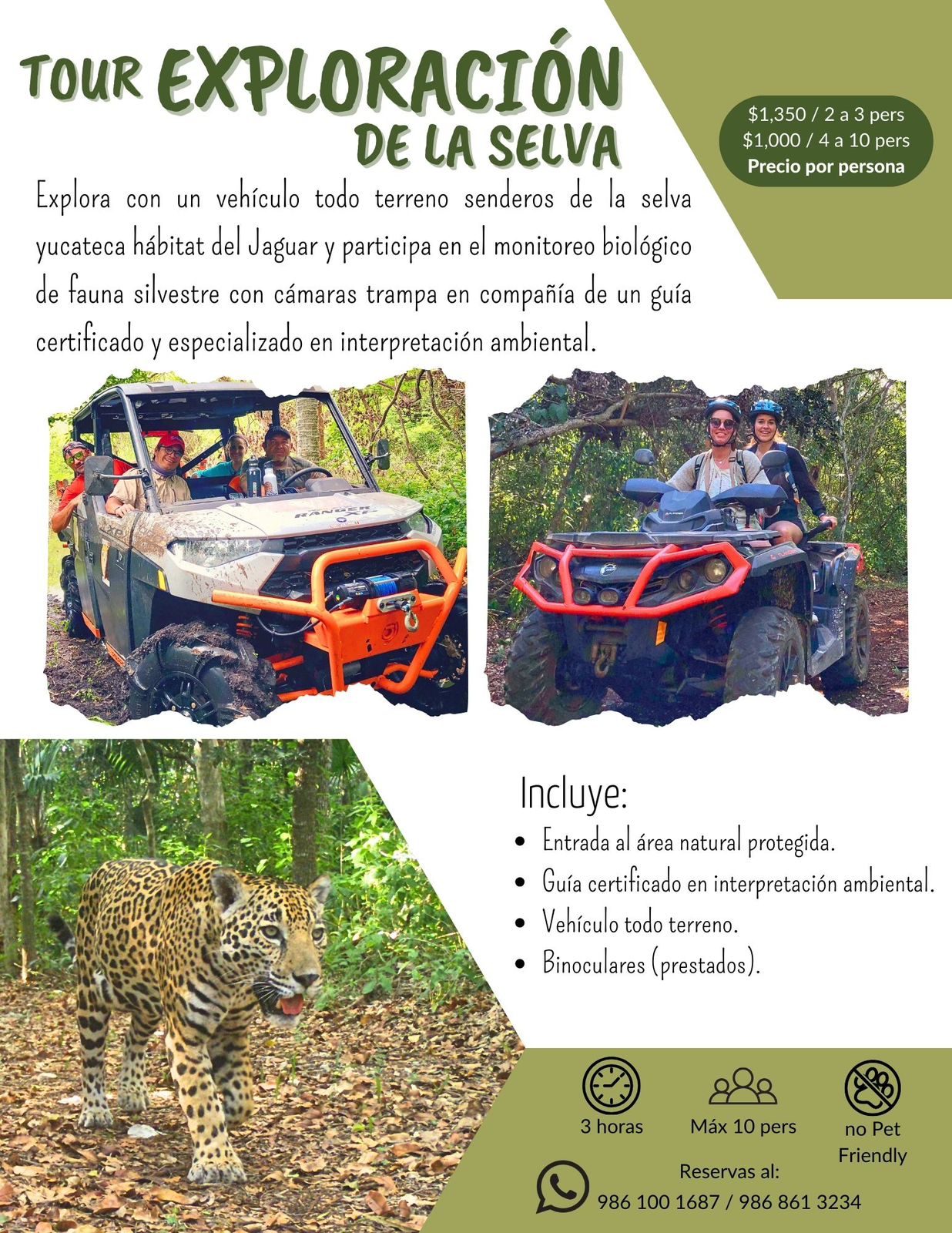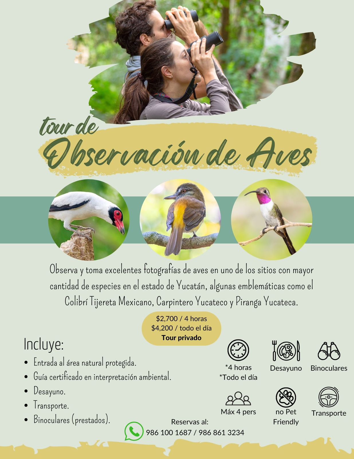 Dése la oportunidad de explorar y capturar los momentos más increíbles de la naturaleza, capte hermosos atardeceres desde nuestro mirador, haga suyos los colores de la naturaleza y logre que el mundo maya sea visto con sus ojos. Disfrute de un viaje único y deje que la Península de Yucatán y las playas azul turquesa de El Cuyo cautiven sus sentidos con este tour para aquellos amantes de la fotografía.