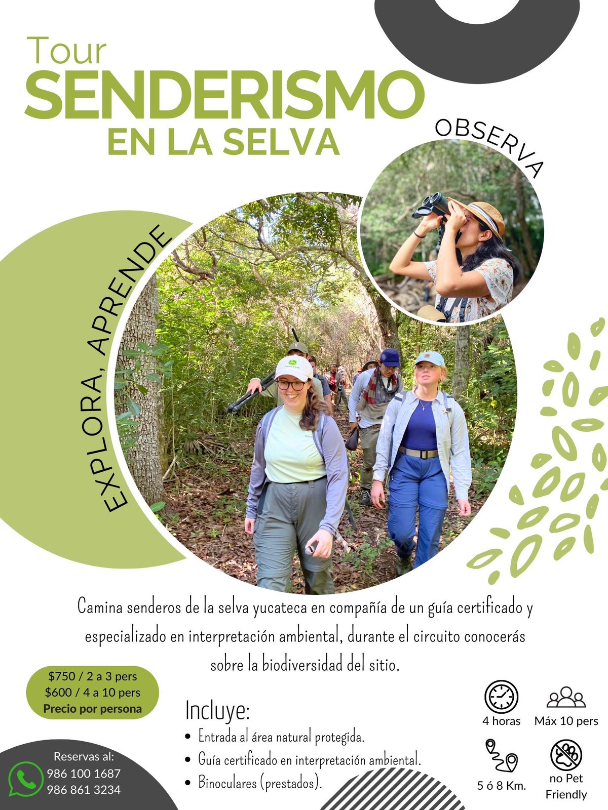 El Senderismo es recorrer a pie las maravillas de la naturaleza, es una actividad que genera placer al caminar en el medio natural de las selvas, descubriendo una diversidad de animales y paisajes inigualables. Es una mezcla de actividad deportiva y turística. La práctica del senderismo no va mas allá de 1 día de marcha y se camina por senderos bien marcados, con distancias cortas y terrenos sin grandes problemas técnicos. Atrévete a recorrer la selva maya que se encuentra en la UMA San Manuel y descubre sus maravillas naturales.